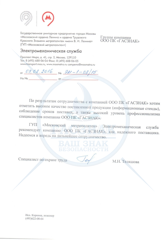 Благодарственное письмо от ГУП «Московский метрополитен» Электромеханическая служба.