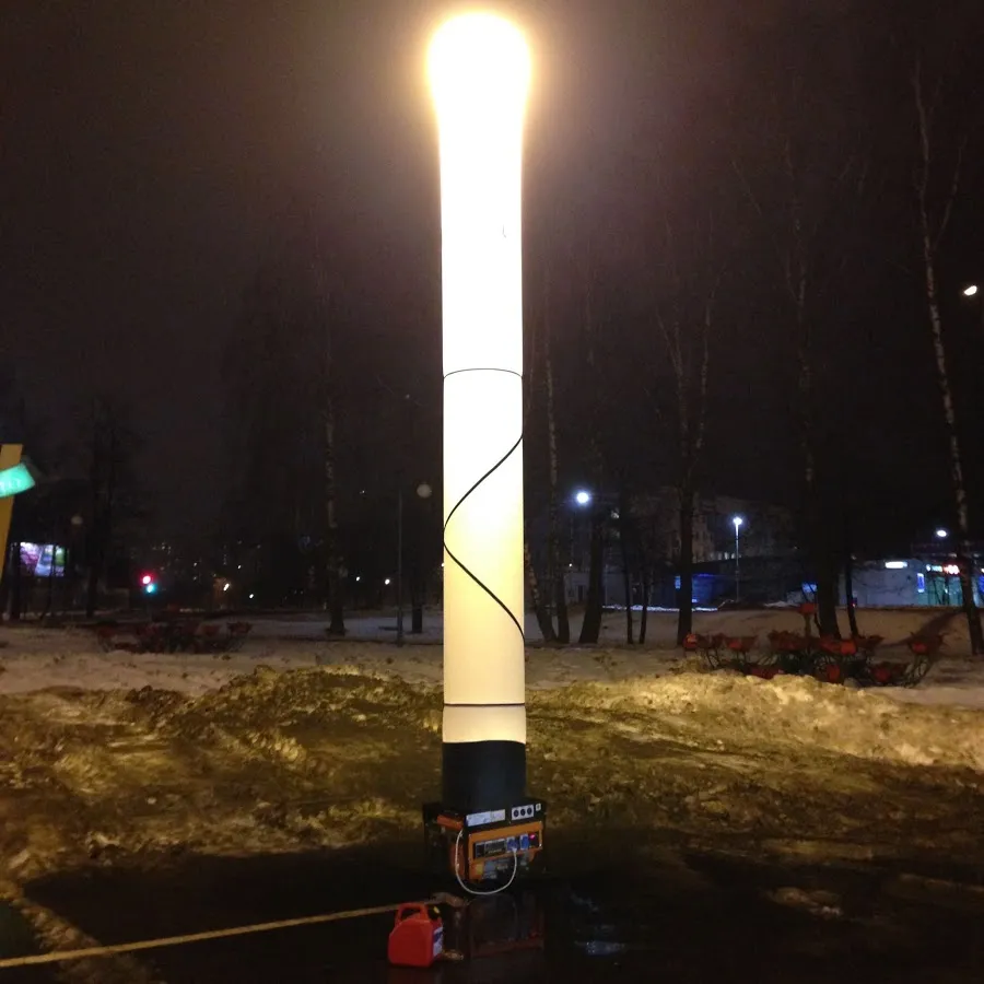 Светильник выглядит как световая башня цилиндрической формы. Тканевый корпус изготовлен из светорассеивающего материала. Цилиндр надувается встроенным вентилятором до высоты 3/5/7 м. Для наддува требуется подключение к генератору или электросети 220 В.