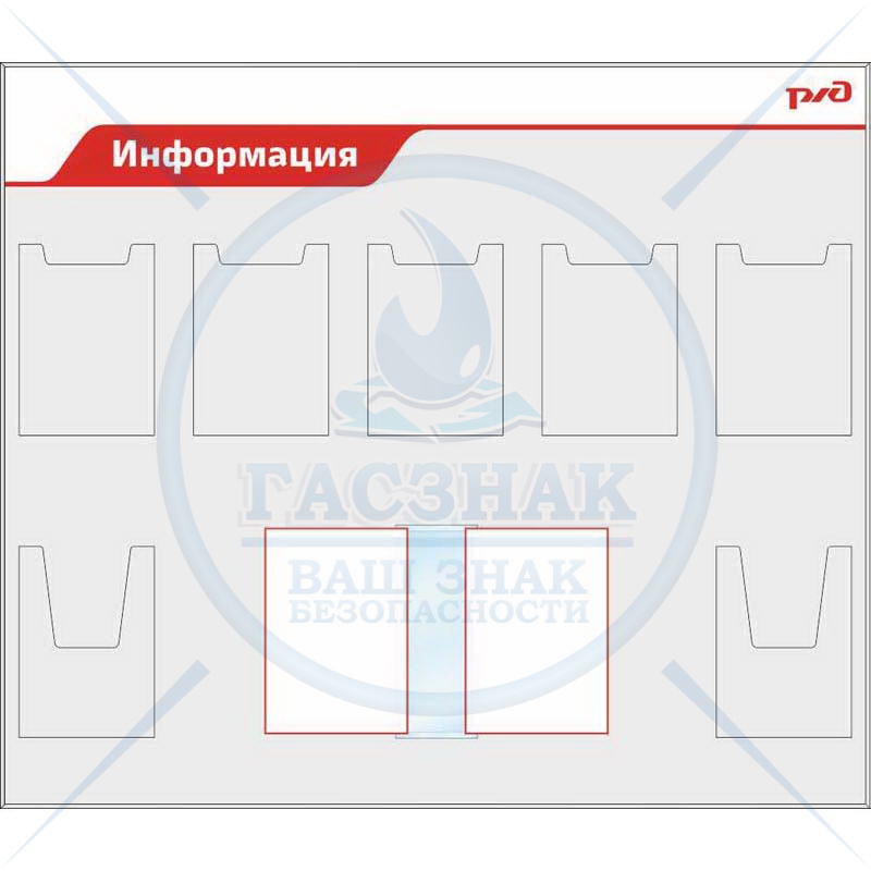 Стенд. Стенд Уголок по охране труда ( 4 кармана формата А4, плоских, 2 кармана формата А4, объемных) стиль РЖД с логотипом, Логотип (1000х1000; Пластик ПВХ 4 мм, алюминиевый профиль; )