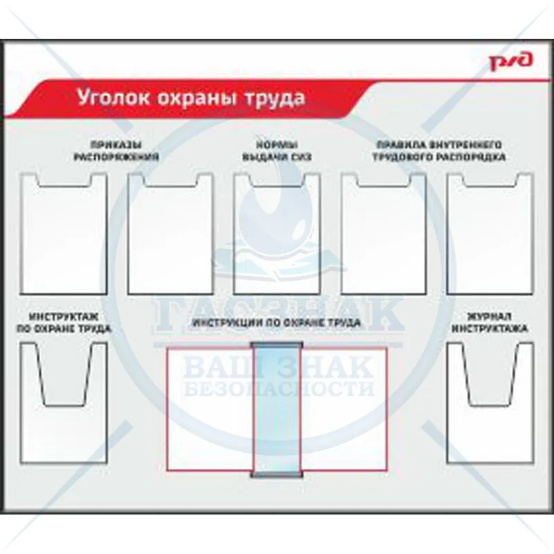 Стенд Уголок охраны труда. ( Пластик ПВХ 4 мм, алюминиевый профиль 1700х1500, 18 карманов А4)