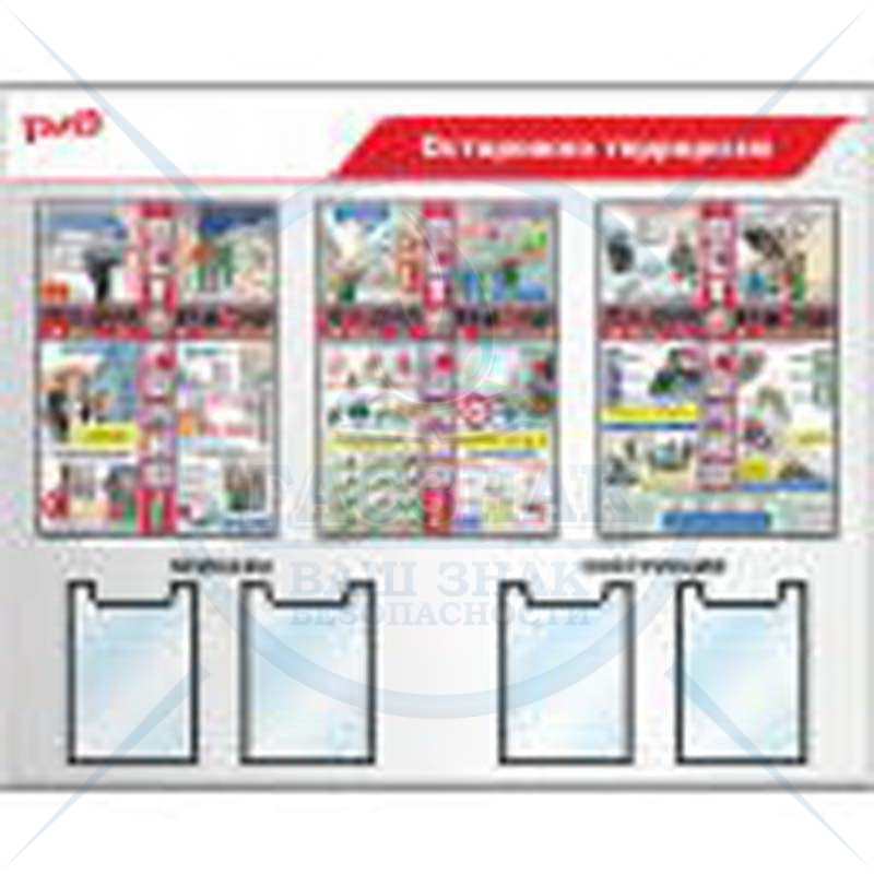 Стенд информационный с перекидной системой А2, с фиксаторами, с наполнением 12 плакатов А2 (3 пл А2 Средства защиты в электроустановках, 3 пл А2 Использование страховочных поясов, 3 пл А2 Работы на высоте, 3 пл А2 Строительные леса) РЖД (1100х850; Пласт