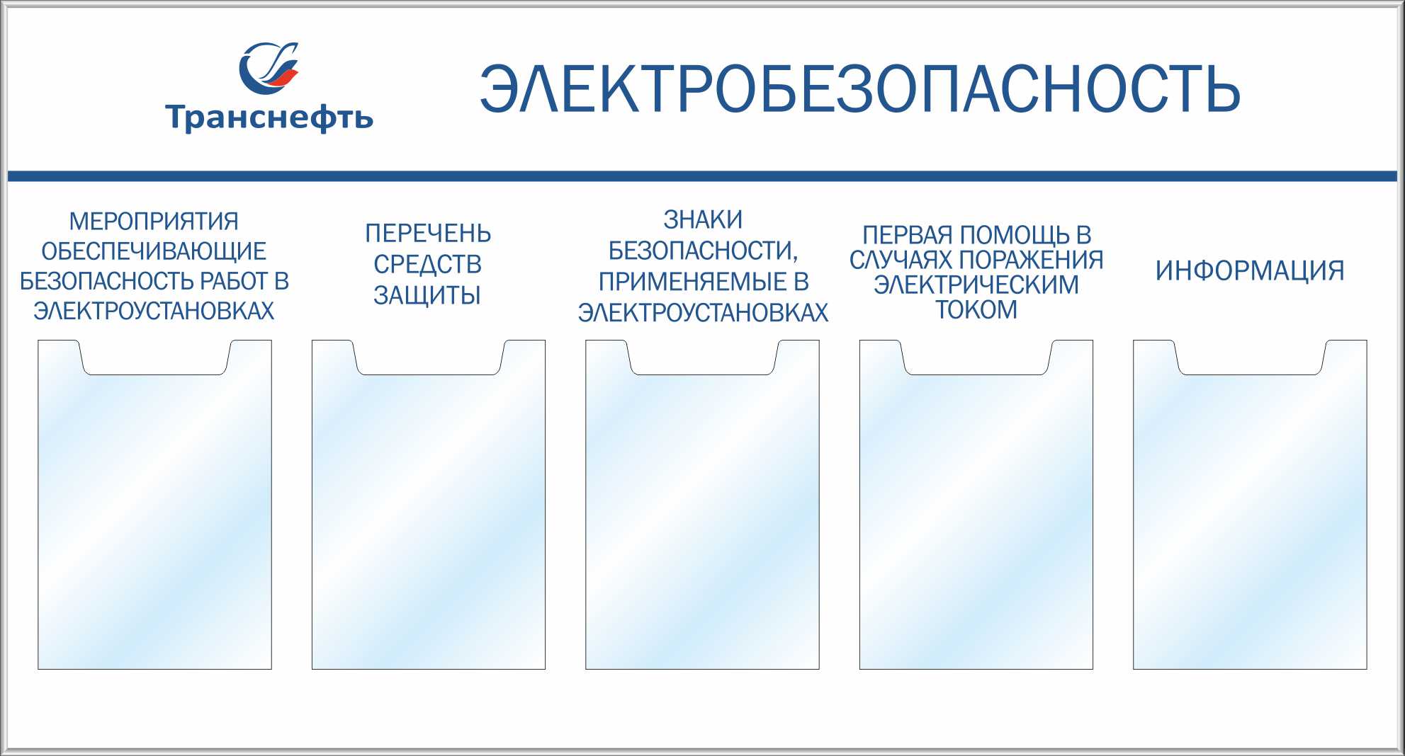 Стенд Электробезопасность, 5 плакатов соуэло А3, объемный карман А4 (1100х1200; Пластик ПВХ 4 мм; Алюминиевый профиль)
