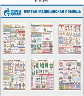Стенды по охране труда Первая медицинская помощь 1200х1000 (пластик ПВХ 4 мм, 6 плакатов), логотип Газпром трансгаз (Пластик ПВХ 4 мм , пленка самоклеющаяся, алюминиевый профиль; )
