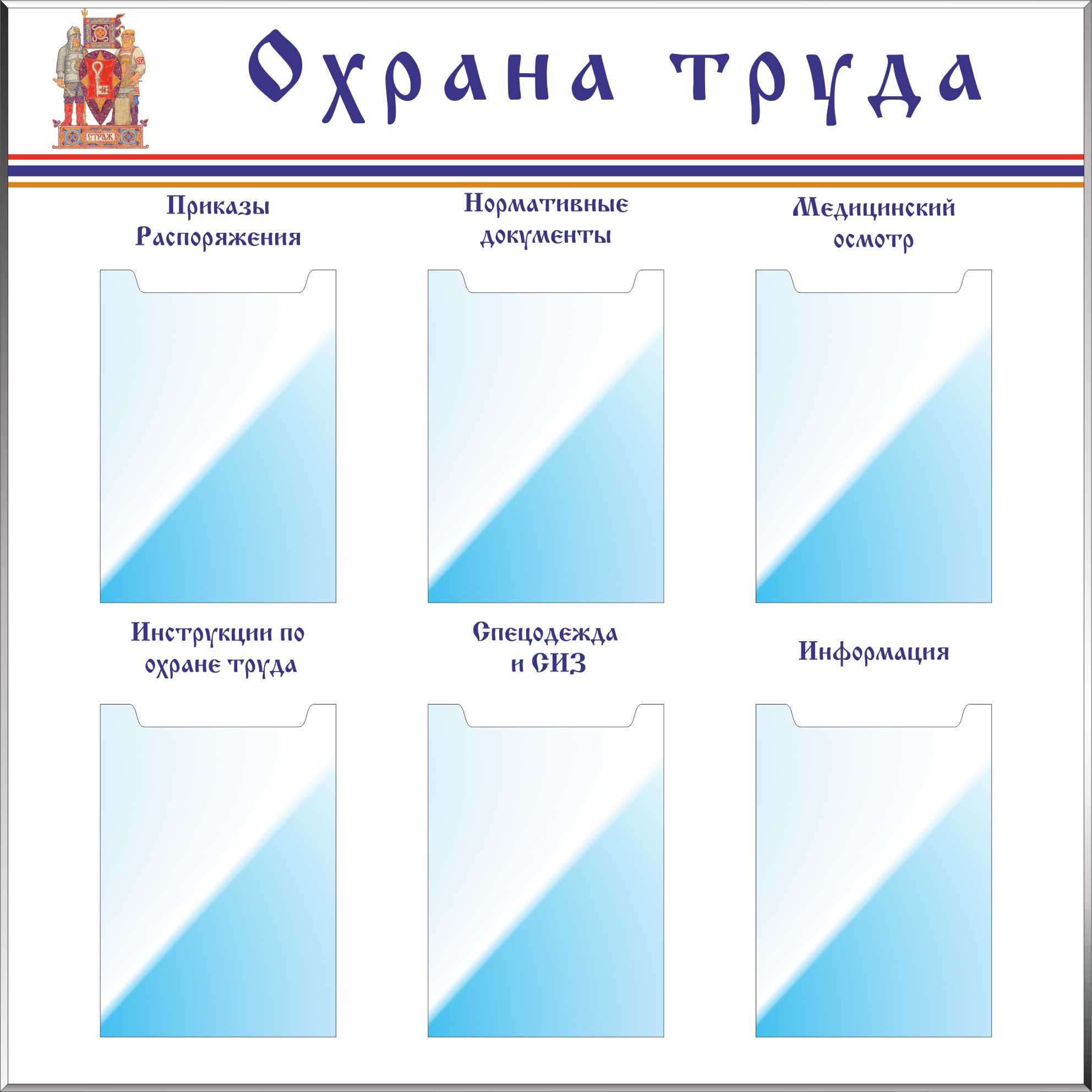 Стенд Охрана труда (Метрополитен) (600х900; Пластик ПВХ 4 мм, алюминиевый профиль, перекидная система А4 на 10 рамок, А4 - 2 кармана объемных)
