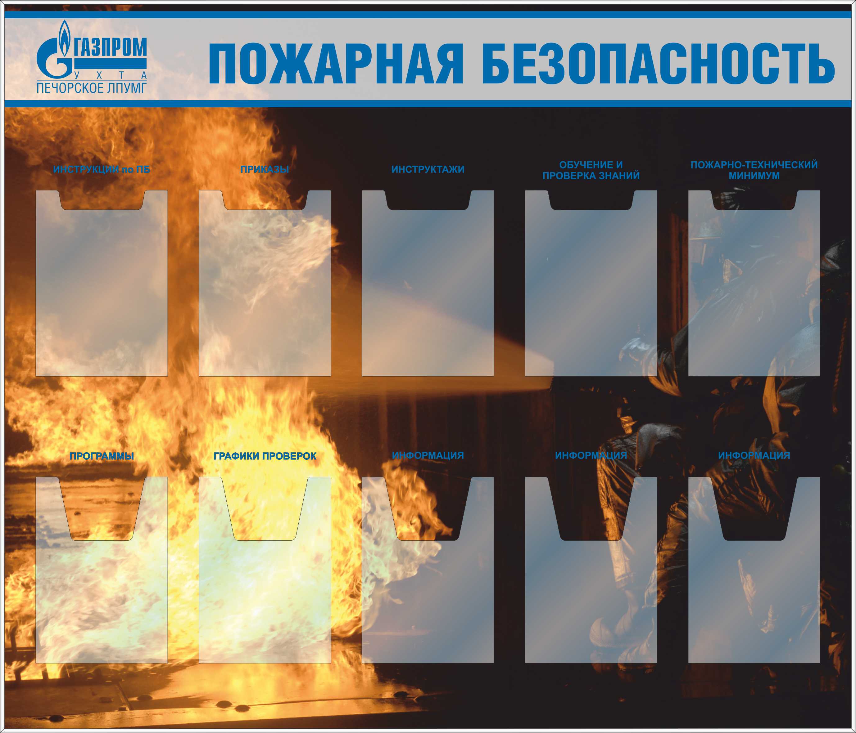 Стенды по охране труда. Стенд Пожарная безопасность ИНФОРМАЦИЯ 1200х1000 (пластик ПВХ 4 мм, 6 плоских карманов А4, 2 плоских горизонт. карманов А4), логотип Газпром трансгаз (1 200х1 000 Пластик ПВХ 4 мм , пленка самоклеющаяся, алюминиевый профиль) (; Пла