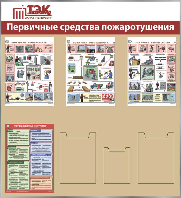 Стенд «Пожарная безопасность» первичные средства пожаротушения) (3 вертикальных кармана А2) (1400х1000; Пластик ПВХ 4 мм, алюминиевый профиль; )