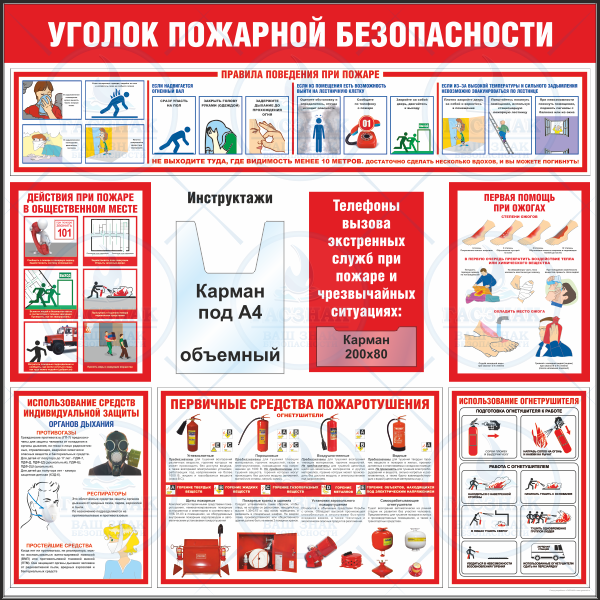 Стенд Умей действовать при пожаре 9 плакатов А3, Логотип (1400х1200; Пластик ПВХ 4 мм, пластиковый профиль; Пластиковый красный)
