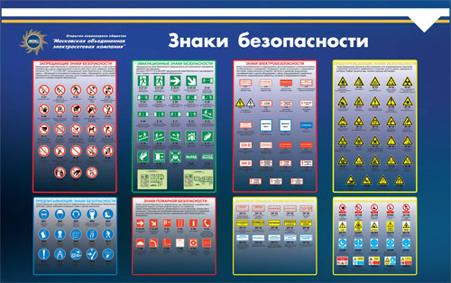 Стенд Знаки безопасности (4 плаката А3 соуэло), логотип (800х1200; Пластик ПВХ 4 мм, алюминиевый профиль; )