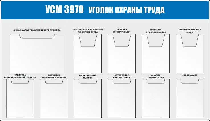 Стенд Уголки по охране труда, алюминиевый профиль, 10 карманов А4 плоских, Гиперглобус