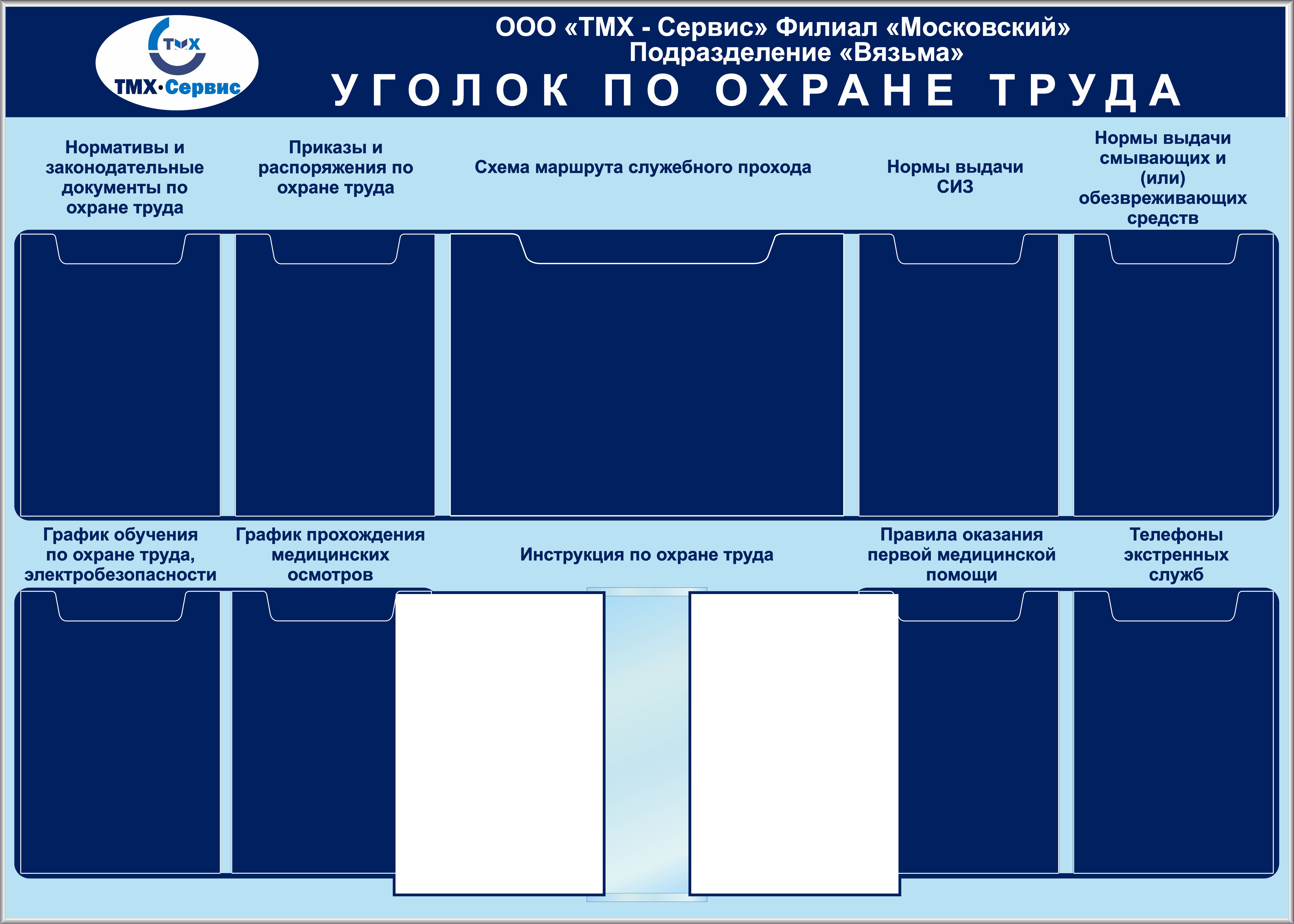 Стенд Уголок охраны труда, 6 карманов А4 (плоские), перкидное устройство на 7 рамок, перкидное устройство на 4 рамки, Логотип (1400х1200; Пластик ПВХ 4 мм; Пластиковый белый)