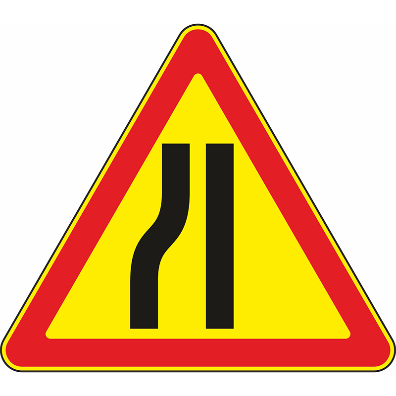 «Сужение дороги слева» предупреждает водителя, что впереди участок дороги с меньшей шириной проезжей части с левой стороны. Знак устанавливают в пределах и вне населенных пунктов: в первом случае — на расстоянии 50–100 м, во втором — 150–300 м до начала сужения. Увидев его, водитель при перестроении со своей полосы обязан уступить дорогу встречному транспорту, который движется, не меняя направления движения. Одновременно, как правило, устанавливают знак о том, что производятся дорожные работы, из-за которых происходит сужение проезжей части.